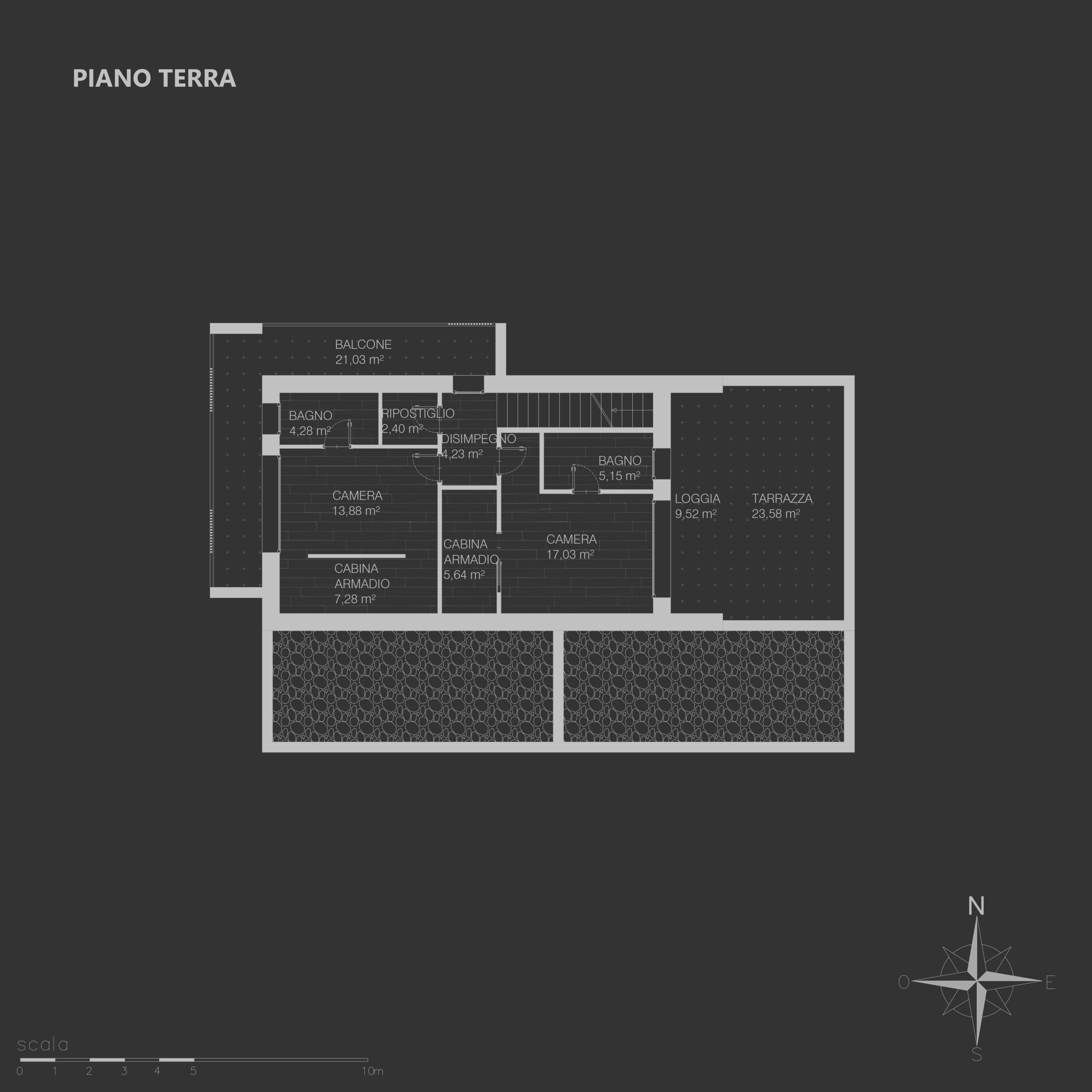 Il piano primo è dedicato alla zona notte, con due camere da letto ciascuna dotata di guardaroba e bagno esclusivi. Questo piano dispone anche di un balcone e un’ampia terrazza, ideali per godere di splendide viste e momenti di tranquillità. La “Residenza Rosetta” è la scelta perfetta per chi cerca un’abitazione moderna e funzionale.